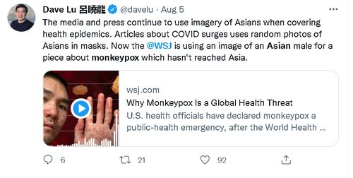 另一方面,在报道传染病时被质疑滥用亚裔图片的媒体,并不只有BBC一家。美国《华尔街日报》今年8月发布一则关于猴痘病毒的视频报道,就因为将一名满脸和满手都是疱疹的亚裔男子作为报道的封面图,而在境外的社交网络上引起了广泛质疑。