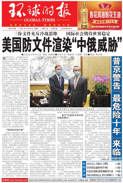 当地时间27日,美国国防部正式发布2022年度《国防战略》《核态势审议报告》以及《导弹防御评估报告》三份重要文件。这几份文件大肆渲染中俄等国的威胁,称俄罗斯“仍对美国构成严重威胁”,中国则是“唯一一个既有意图,也越来越有能力在军事、经济、技术和外交方面全面系统性挑战美国的竞争者”。多名中国学者28日接受《环球时报》采访时表示,这几份战略文件一如既往地延续了零和思维、冷战思维,显示出美国继续通过制造假想敌企图谋求绝对军事优势和霸权,是在有意挑动大国军备竞赛,这对世界的和平与发展会造成直接的现实恶劣影响。就连美国《华盛顿邮报》也担忧,这显示出“一场与中国和俄罗斯的军备竞赛正在酝酿之中”。当天,中国外交部发言人汪文斌在记者会上回应称,美方在报告中对中国正常的核力量现代化指手画脚、妄加揣测,明目张胆针对中国量身定制核威慑战略,中方对此严重关切并坚决反对。28日,中共中央政治局委员、国务委员兼外长王毅接受了美国驻华大使伯恩斯到任拜会。王毅说,中美关系正处于紧要关头。国际社会普遍期待中美关系能够稳定发展。作为两个大国,中美谁也改变不了谁,美方不要再试图从实力地位出发同中国打交道,不要总想着打压遏制中国的发展。作为驻华大使,希望你成为中美之间的桥梁和纽带。