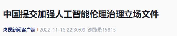 中国裁军大使李松11月16日率团出席在瑞士日内瓦举行的联合国《特定常规武器公约》2022年缔约国大会,并向大会提交了《中国关于加强人工智能伦理治理的立场文件》。