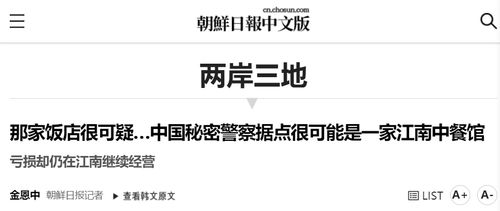 《朝鲜日报》有鼻子有眼的说,一家位于首尔江南的三层中餐厅,是中国南通市公安局设立的“警察站”。