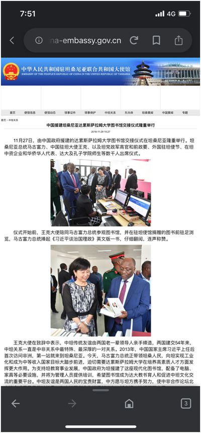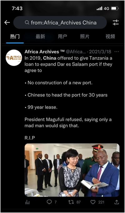 例如:在一条挑唆中国和坦桑尼亚关系的推文中,Africa Archives借着坦桑尼亚前总统马古富力逝世,宣称他2019年曾拒绝了中国的“无理要求”,称“疯子才会和中国签协议”。然而,配图却是中国援建坦桑尼亚达累萨拉姆大学图书馆的交接仪式上,王克大使和马古富力总统的亲切互动。