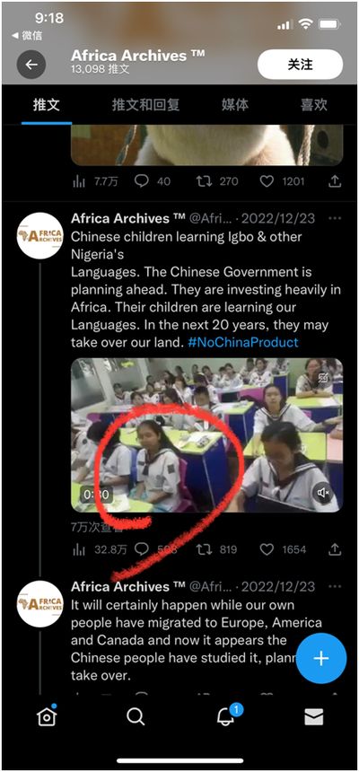 配着这段几十秒的视频,一个名为“Africa Archives”的账号声称,这是中国孩子在学习伊博语。Africa Archives危言耸听地说,再过20年,中国人将占领非洲。由于尼日利亚人大量移民到欧洲、美国、加拿大,放任中国人这样干会让中国在未来占领该国。