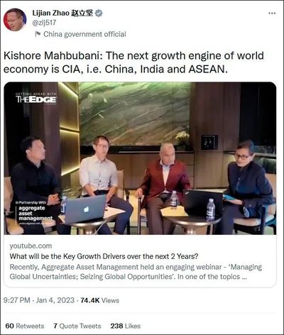 1月4日,时任外交部发言人赵立坚转发马凯硕在2022年8月的采访