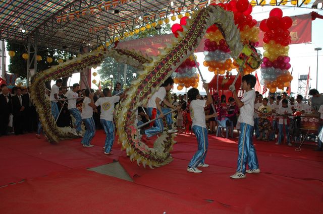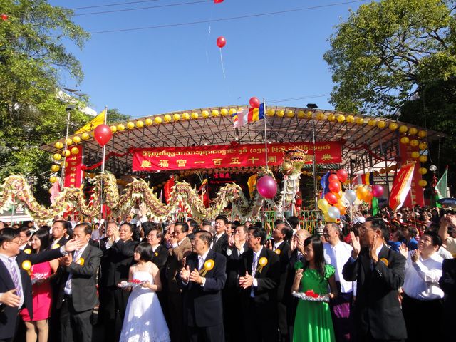 公元二0一一年十一月十一日乃庆典正日,一早庆福宫信托部代表们齐聚宫门前,迎接前来道贺的太原堂宗亲们,大约七时半时,由王鼎汉理事长及王金韵名誉理事长率领的朝拜道贺队伍,在舞龙队引导下浩浩荡荡而来,全队西装一致,队伍整齐,足见隆重和盛情,除供品外还有唐僧师徒们压阵,拜过观音菩萨和玉皇上帝后,在宫前集体合影,舞龙队在场上翻腾献技,一旁观众们争相趋前与唐僧师徒合照,此时只闻远处锣鼓喧天,原来巨轮社铜乐队前来道贺,这支缅华界仅有的铜乐队,训练有素,服装亮眼,吸引大批香客围观,铜乐队绕场奏乐,操步致礼,煞是好看。不久一辆大游览车停在宫前,载来仰光各寺庙华人僧尼,计华僧四十二位,比丘尼二十二位,鱼贯下车进宫,众善信在两旁合什恭迎前往内殿,另一边信托部代表们也准备举行庆典开幕礼,宾主皆移往宫前大马路,良辰吉时一到,由张家荣主任,王鼎嘉、许斐宗副主任及宫务组长黄泉祥四位剪彩,彩球升空,掌声雷动,在一片欢呼声中开启了庆典序幕。待僧尼们用过斋膳后,华僧在前,善信们在后,比丘尼在旁,列队在天公坛前诵经祈福,铙钹齐鸣,梵音高诵,信托部代表暨善信们逐一往坛前添香跪拜,场面肃穆庄严。闻经祷告完毕后再由大法师引领至广场,为场上三座大铜香炉开光,大铜香炉价值不菲,中间最大的那一座是由金龙王香主人郑淑珍暨女陈金珠合府捐献,其余两座较小的圆香炉,一座由庆福宫信托部代表吴善琴、黄丽茵合府捐献,另一座由叶孙明、林碧枝合府捐献,这批香炉是三天前刚由大陆运到,观音有灵,让它及时赶上庆典,信托部代表们列队执香观礼。然后众僧尼列队徐行,由众善信施主与信托部代表们布施,后集体与法师僧尼在宫前摄影,最后由大法师诵经,众人合掌恭听,法会在一片善哉声中结束,中午的素席,由百尺路南勃陀斋餐馆办,色香味齐全,大伙大快朵颐,席上有人戏言:”有这样的菜,天天吃斋,有何不可” 此君可能不知,素席不便宜,几与荤席同价。