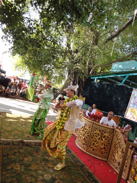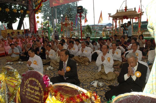 公元二0一一年十一月十二日清晨,庆福宫前又是另一番景象,布置装璜全如缅族人作大布施的场面,宝幡法器,布施用品,一应俱全,庆福宫代表们也大都缅式盛装打扮,大家互相打量,颇觉别致有趣,纷纷拍照留念,原来今日延迎缅甸国家僧侣大法师协会主席高僧暨轮值大法师十七位及绵旺比丘尼授经学堂住持师太暨比丘尼十八位将驾临本宫开坛诵经,仰光好多社会贤达及施主们都一早到来恭侯,上午九时正,接驾车辆纷纷到来,高僧、师太皆都入座,众多善信必恭必敬,席地而跪,虔诚膜拜,聆听高僧弘法诵经,间或随高僧诵念经文,或高念” 善哉!善哉!” 呈现一片霭瑞祥和气氛,殿前也有如梵音净土,让人深深体会到佛教早已深入缅甸社会,成为缅甸人生活中的重要部份,此次中国佛牙舍利子第四次至缅甸,细思量之,显见中国领导人为了中缅两国人民友谊,用心良苦。听经闻忏后由信托部代表们用银壸往银瓢里倾注圣水,象征所造就的功果让众生分享,虔礼佛圣后,再列队趋前向高僧施物祈福,最后庆福宫主任、副主任向众人抛洒泡米和折折成小块的纸币,以示功德圆满。恭送僧尼后,在庆福宫的庆典程序基本完毕,信托部代表们用过斋膳后,皆往福山寺大礼堂视察明日晚宴的准备工作。