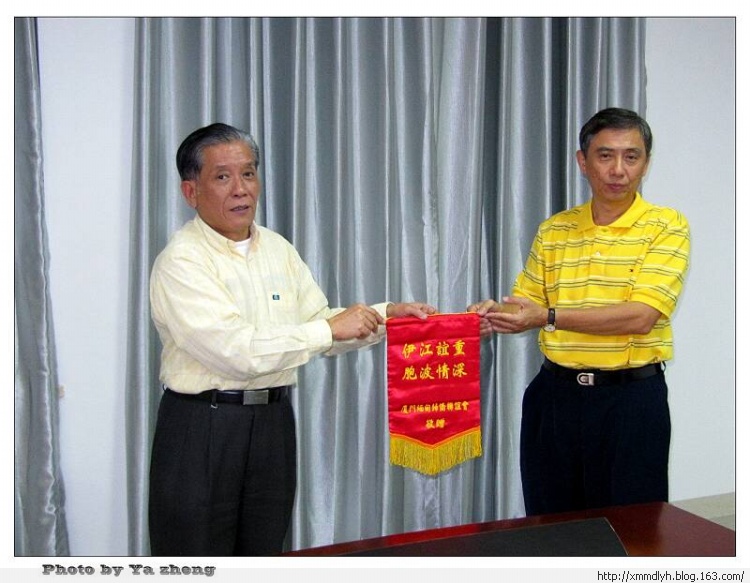 厦门缅甸归侨联谊会秘书长陈汀阳向仰光曾营崇圣堂理事长曾荣庭赠送锦旗