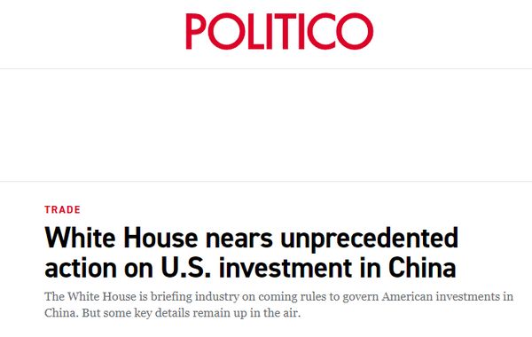 报道称,关于这项将于本月晚些时候出台的“限制美国(公司)在中国投资”的规则,美国白宫已开始向在华美国商会及在美行业组织等团体介绍该行政令的大致内容,该命令预计将要求美国企业向美政府通报对中国科技公司的新投资情况,并禁止美企业在微芯片等关键领域与中方进行交易。不过,报道同时表示,目前该规则中的一些关键细节尚未确定。