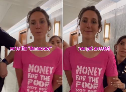 被国会警察戴上手铐带走时,奥利维亚表示,“五角大楼今年的预算接近一万亿美元。我们正在中国周边建立更多的(军事)基地,却没有钱去改善住房问题、气候问题、医疗保险……五角大楼是这个世界上最大的污染者。”