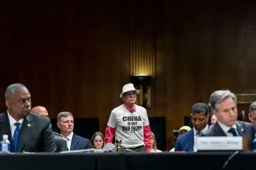 当地时间16日,就在拜登内阁三大部长布林肯、奥斯汀、雷蒙多罕见同台炒作对华竞争,要求国会迅速拨款以对抗中国之时,美国知名反战组织“粉色代码”(CODEPINK)再次正义发声,在听证会现场发起抗议活动,多名成员手举横幅,身穿标语T恤,喊出“中国不是敌人”、“把钱给穷人而非战争”等反战口号。