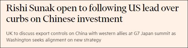 据英国《金融时报》和“天空新闻”报道,苏纳克是在飞往日本参加G7峰会的专机上接受采访的。苏纳克称,正在考虑效仿华盛顿的做法,对投资中国关键行业的英国公司实施新的限制。