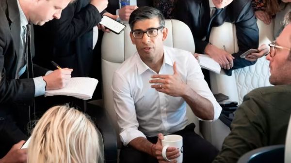 苏纳克在17日飞往日本的专机上与记者交谈/《金融时报》图