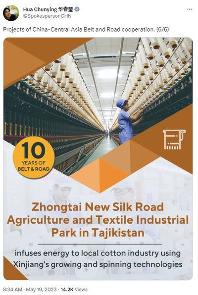 华春莹所发第6张图展示的是中泰新丝路塔吉克斯坦农业纺织产业园,配文称该园区通过使用新疆的种植和纺织技术为当地棉花产业赋能。↓