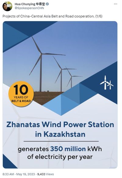 华春莹当天所发第1张图展示的是哈萨克斯坦札纳塔斯小镇的风电场,配文称该风电场每年的发电量为3.5亿千瓦时。↓
