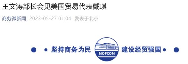 5月26日,商务部部长王文涛在美国底特律参加亚太经合组织贸易部长会议期间,会见了美国贸易代表戴琪。双方就中美经贸关系和共同关心的区域和多边议题进行了坦诚、务实、深入的交流。中方就美对华经贸政策、经贸领域涉台问题、印太经济框架、301关税等重点问题提出关切。双方同意继续保持交流沟通。