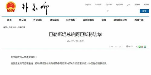 应国家主席习近平邀请,巴勒斯坦国总统马哈茂德·阿巴斯将于6月13日至16日对中国进行国事访问。