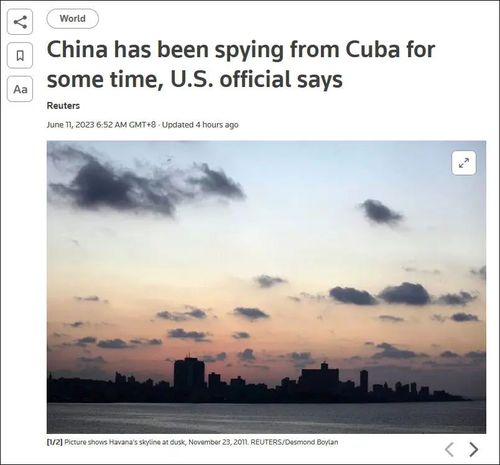 路透社先是提到,美国《华尔街日报》此前当地时间8日曾发布报道,称中国与古巴达成了一项“秘密协议”,将在距离美国佛罗里达州仅约160公里的岛上建设所谓“电子窃听设施”,但美国和古巴政府均对该报道表示“强烈怀疑”。