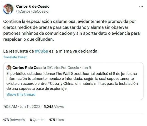 不过,这个“最新消息”也很快被古巴副外长卡洛斯·费尔南德斯·德科西奥再度驳斥。“诽谤性的猜测仍在继续,这显然是由某些媒体推动的,目的是造成伤害和恐慌。”他当地时间10日在推特上写道,“他们没有遵守最低限度的沟通标准,也没有提供数据或证据来支持他们传播的内容。”