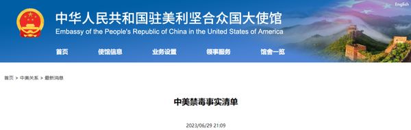 6月30日,中国驻美国大使馆发布《中美禁毒事实清单》。全文如下: