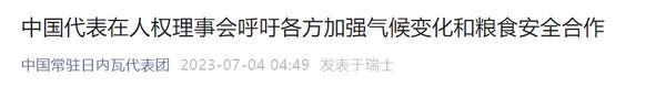 7月3日,人权理事会举行气候变化对享有粮食权负面影响相关会议,中国代表发言呼吁各方在全球发展倡议框架下加强气候变化和粮食安全合作。