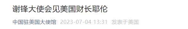 7月3日,中国驻美大使谢锋会见美国财长耶伦。双方就中美关系及共同关心的多双边经济金融问题交换了意见。……