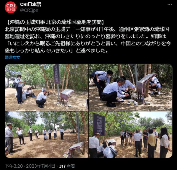 冲绳县知事玉城丹尼7月3日起开始访华行程。据中国国际广播电台日语广播推特(即“CRI日本语”)消息,7月4日下午,正在北京访问的玉城丹尼参观了位于北京通州区张家湾的琉球王国墓地遗址,并按照冲绳习俗扫墓。
