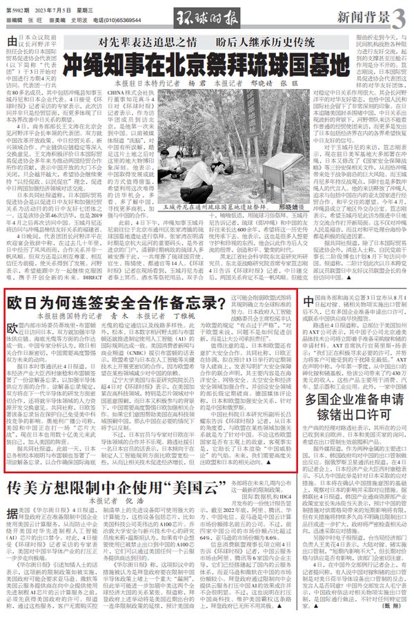 辽宁大学美国与东亚研究院院长吕超4日对《环球时报》表示,在美国加紧在高科技领域,特别是芯片领域对中国恶意围剿,而日本又积极参与的背景下,中国需要高度警惕日欧加强相关合作。如果它们意图帮助美国在高科技领域围剿中国,那么中国在必要的情况下将予以反制。