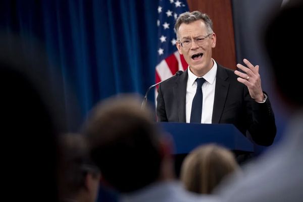 当地时间2023年7月7日,美国华盛顿特区,美国国防部负责政策事务的副部长科林·卡尔在五角大楼举行的新闻发布会上发表讲话。图源:视觉中国