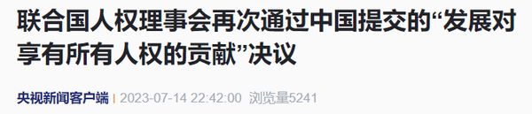 7月14日,联合国人权理事会第53届会议再次通过中国提交的“发展对享有所有人权的贡献”决议。