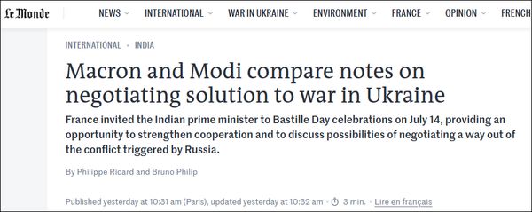 报道称,此次马克龙同莫迪的会晤,为商讨解决俄乌冲突的新尝试奠定了基础,两人就俄乌冲突的谈判解决方案交换了意见,旨在打破目前的外交僵局。《世界报》并未披露印法有关俄乌冲突解决方案的任何细节,但强调“该计划似乎与中国和其他几个国家此前提出的倡议有所不同”。