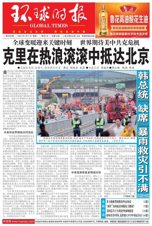 “当中美试图修复破裂的关系之际,克里抵达热浪滚滚的北京。”美国有线电视新闻网(CNN)称,克里16日开启人们期待已久的(美中)重启气候谈判之旅。当克里走下飞机时,遇到的是北京有记录以来最炎热的夏天。自1951年以来,北京经历了11天超过40摄氏度的高温,而近一半的时间发生在过去几周,北京日前还创造了该城市史上最热的纪录。同样,在美国,极端热浪也在肆虐,西南一些地区的气温已飙升至49摄氏度。报道称,这显然是一个全球性危机,地球本月已连续4天记录了迄今为止最热的气温。报道引述绿色和平组织专家的话称:“尽管中美在政治上存在分歧,但气候变化的影响现在已成为两国的共同经历——它不再是一个假想的危机或人为分析出来的挑战,而是一个切切实实感受到的活生生的现实。”