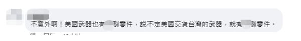 “不意外啊!”还有网友称,美国武器也有大陆制零件,说不定美国交货台湾的武器,就有大陆制零件。↓