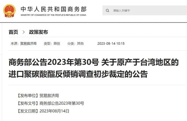 商务部公告2023年第30号 关于原产于台湾地区的进口聚碳酸酯反倾销调查初步裁定的公告