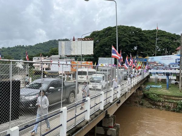 8月5日,澎湃新闻记者赶到泰国湄赛与缅甸大其力一河之隔的湄赛口岸时,湄赛桥两旁的护栏上密密麻麻插着泰、缅两国的国旗,近年还新增了铁丝网护栏,跨过长约100米的桥面就能入境对方的领地。泰国靠左行驶,缅甸靠右行驶,两边通行的车辆在湄赛桥上变道,以致桥面经常发生车辆拥堵。记者观察的这段时间,泰国人和缅甸人往来穿梭于其间,没看到中国人面孔。