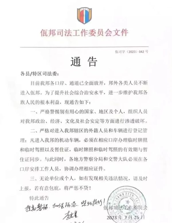 7月25日,佤邦司法工作委员会发布了一个内部文件,要求各县、特区严格警惕偷渡者,并要求对入佤邦的外籍车辆和人员严格登记,各地警察分局和交警大队在口岸协调办理相应证件。