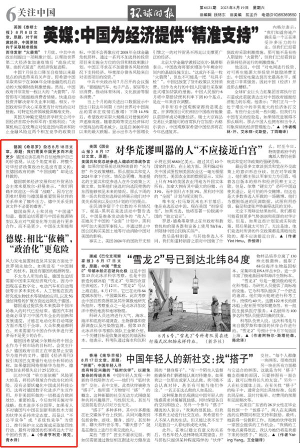 比对中国“单方面依赖”风险更大的是,将经济领域合作政治化的风险。没有必要妖魔化中国或其科技公司,这将对德国数字化进步产生反作用,并非美国所做的一切都适合欧洲效仿。重要的是,今后如何实施对华战略。技术进步不分国界,如果有人不对德国与中国在创新和新技术方面的伙伴关系持肯定态度,而是以“不公平竞争”或“系统性竞争”为借口,推行保护主义政策或采取惩罚性行动,最终对德国的伤害将远大于对中国的伤害。(作者亨利克·博克,青木译)