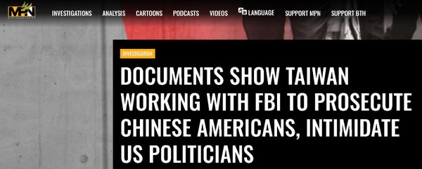 近日,美国左翼独立媒体MintPressNews曝光一个台湾当局与美国联邦调查局(FBI)之间的大秘密,称台湾当局一直在通过诸如“台北经济文化代表处”这样的驻美机构与FBI合作,对一些对华友善的人——尤其是美籍华人,进行政治迫害。