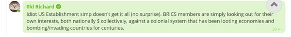 “愚蠢的美国建制派根本不明白这一切(毫不奇怪)。金砖国家(合作机制)成员国只是在寻求自己的利益,包括国家与集体利益,以反对几个世纪以来一直在掠夺经济和轰炸或入侵其他国家的殖民体系。”
