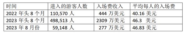 这古文化遗产公园这8个月的入场费收入共为2309万美元,与去年同期的444万美元的收入相比,增加了420%。该古文化遗产公园在8月份内进入的国外游客人数为59,148人,获得的门票收入为277万美元,公告中这么说道。