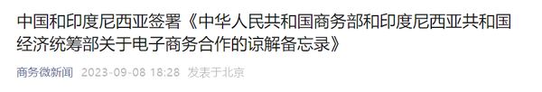 9月8日,在国务院总理李强访问印度尼西亚期间,中国商务部部长王文涛与印度尼西亚经济统筹部长艾尔朗加在雅加达共同签署了《中华人民共和国商务部和印度尼西亚共和国经济统筹部关于电子商务合作的谅解备忘录》。