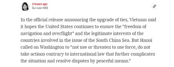 根据《纽约时报》的说法,在越南发布的新闻稿中,越南表示希望美国继续确保“航行和飞越自由”以及南海问题相关国家的合法利益,但也同时呼吁华盛顿“不要使用或威胁使用武力,不要采取违反国际法的行动,使局势进一步复杂化,并通过和平方式解决争端”。