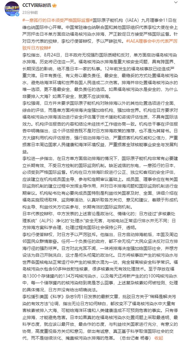 国际原子能机构(IAEA)九月理事会11日在维也纳国际中心开幕。中国常驻维也纳联合国和其他国际组织代表李松大使在会上严厉抨击日本单方面启动福岛核污染水排海,严正敦促日方接受严格国际监督。针对日方代表的狡辩,李松行使答辩权,予以严辞驳斥。