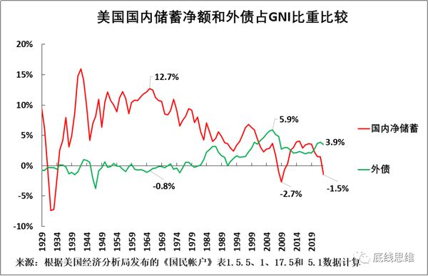 但自1965年起,美国国内储蓄净额/资本形成净额占GNI比重逐渐下降,到2009年这一比重降至-2.7%。也即是说,2009年,美国资本消耗的增长速度快于美国储蓄/资本形成总额的增长速度——按净值计算,美国没有创造资本。造成这种情况的过程是,2009年美国固定资本折旧占GNI比重为16.4%,但美国储蓄/资本形成总额占GNI比重为13.8%。因此,美国国内资本形成总额/储蓄甚至不足以抵消贬值的资本。