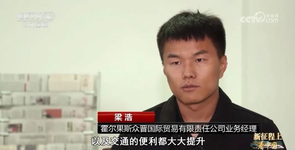 霍尔果斯到乌兹别克斯坦是1300公里,霍尔果斯到四川、就是我媳妇的老家那里是3000公里,霍尔果斯到乌兹别克斯坦的时间是(更)近。“一带一路”(倡议)开通(提出)以后,你们中国的高速公路到达乌兹别克斯坦,以前(货物到达乌方)大概有3到5天,现在是可以18个小时到24个小时。