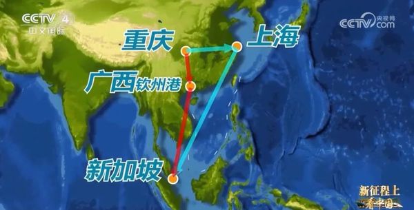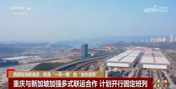 郑弋俊提到的“陆海新通道”,通过铁海联运连接重庆、钦州和新加坡等东盟国家,它与传统的水水联运,也就是先走江运到上海,再走海运到东盟相比,可以说是把绕的弯“拉直”了,运输时间节约百分之三四十。