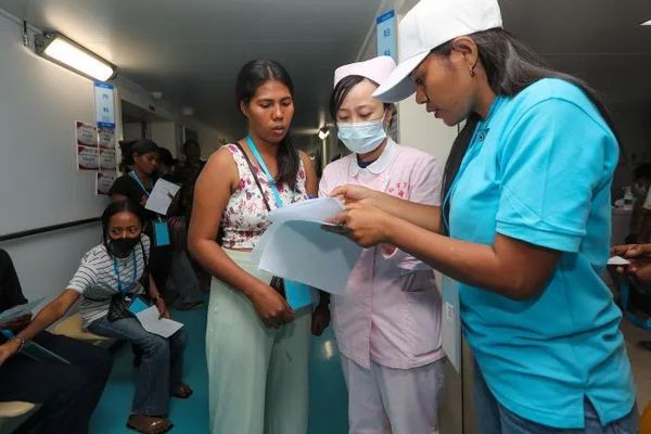 9月8日,中国海军“和平方舟”号医院船访问东帝汶并开展医疗服务期间,医院船医护人员为当地民众提供医疗服务。(新华社发)