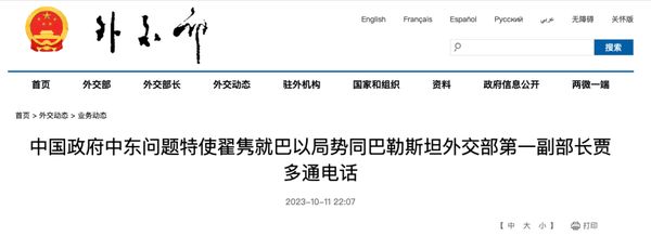 中国政府中东问题特使翟隽就巴以局势同巴勒斯坦外交部第一副部长贾多通电话2023年10月11日,……