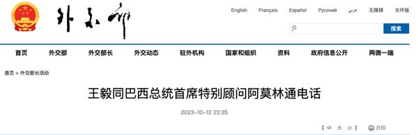 2023年10月12日,中共中央政治局委员、中央外办主任王毅应约同巴西总统首席特别顾问阿莫林通电话。