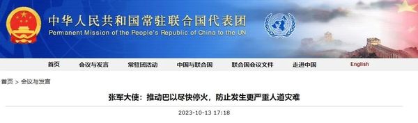 10月13日,中国常驻联合国代表张军大使在安理会紧急磋商中,针对当前严峻的巴以局势阐述中方立场,呼吁作出一切努力,推动尽快实现停火,防止发生更严重的人道灾难。