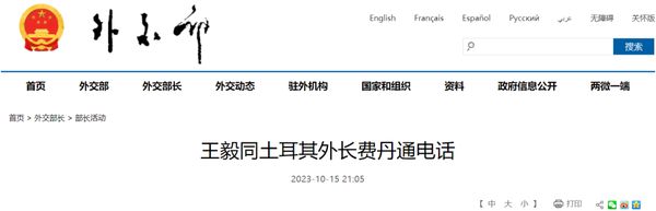 2023年10月15日,中共中央政治局委员、外交部长王毅同土耳其外长费丹通电话。