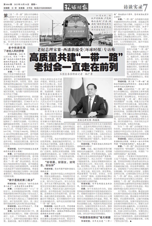 宋赛:当前,地区和国际形势不断面临经济金融危机、自然灾害、疫情暴发、跨国犯罪、冲突等国际挑战,这些对地区以及全球的经济造成严重影响。在这种情况下,我认为任何一个国家都不能独善其身,各国必须根据本国的实际情况相互合作、相互支持、相互鼓励、相互帮助。因此,老中党、政府和人民之间的合作关系将不断加强和深化,相互交流、相互支持、相互帮助,两国要秉承“好邻居、好朋友、好同志、好伙伴”精神,在国际和地区